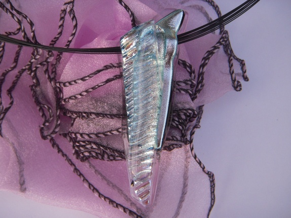 Unikt smykke i glass, sølvaktig. Ca 5 cm langt.