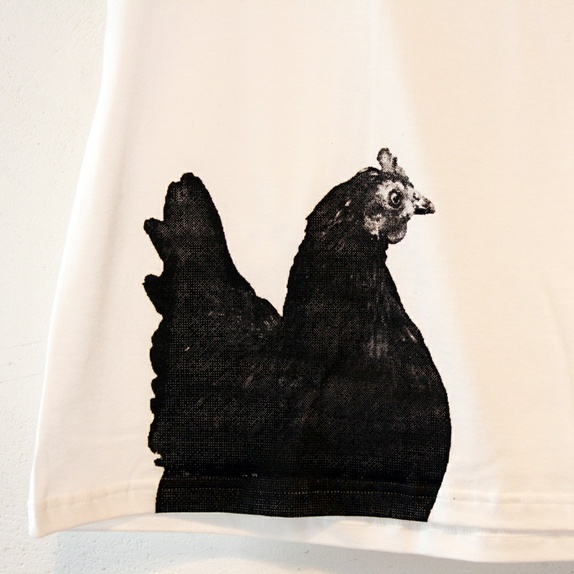Hvit t-skjorte, sort hønetrykk.