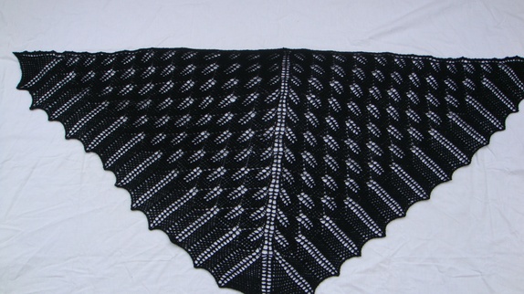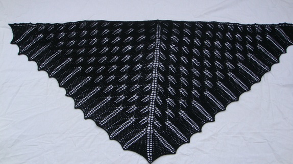 Sjalet er strikket i 100% Marino ull. Målene på sjalet er 138 cm i overkanten og fra topp til spiss midt bak er det 64 cm