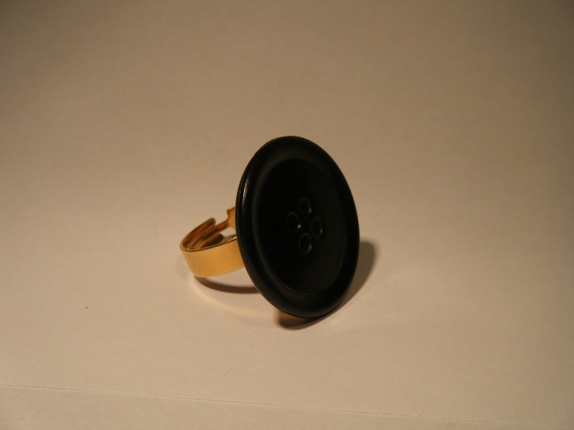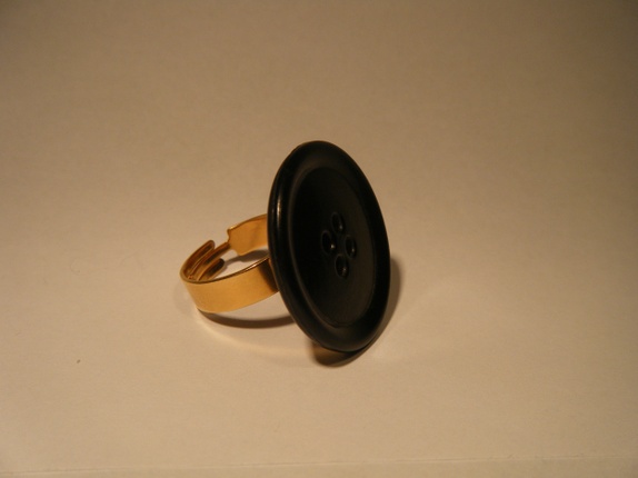 En ring laget med en gjenbruksknapp fra Australia. Knappen er sort og ca 2,5cm i diameter. Ringen er justerbar slik at den kan passe alle fingre.