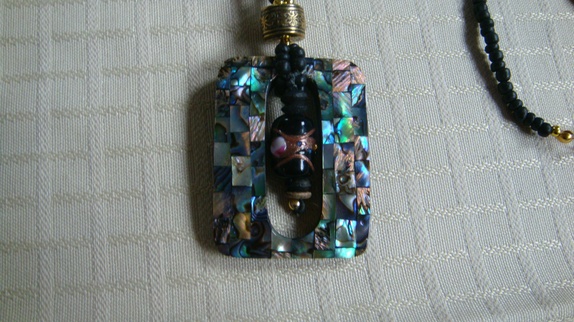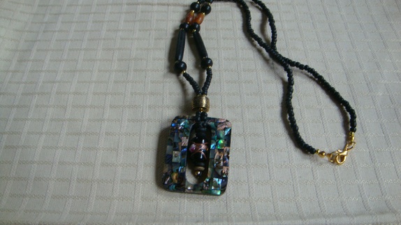 kjedet er bla laget av kokosperler ,glassperle og metall del. Lengde 60 cm uten firkanten. Ferdig ned priset. se flere smykker i butikken.