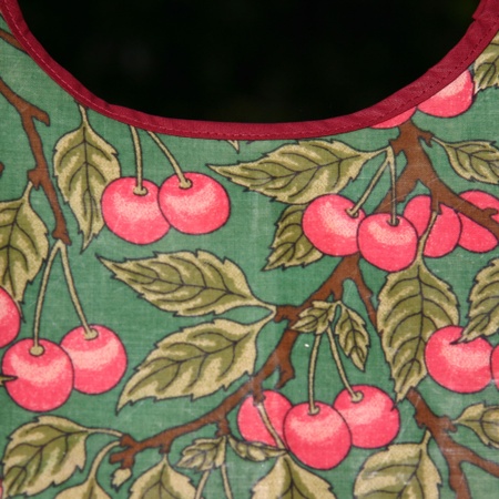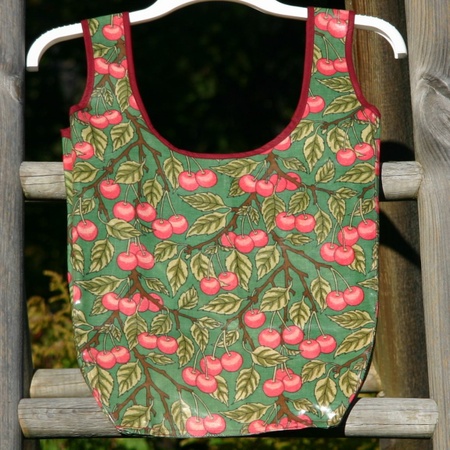 Sydd av kirsebærmønstret voksduk fra loppemarked og kantet med burgunder skråbånd. Denne er lik på begge sider.