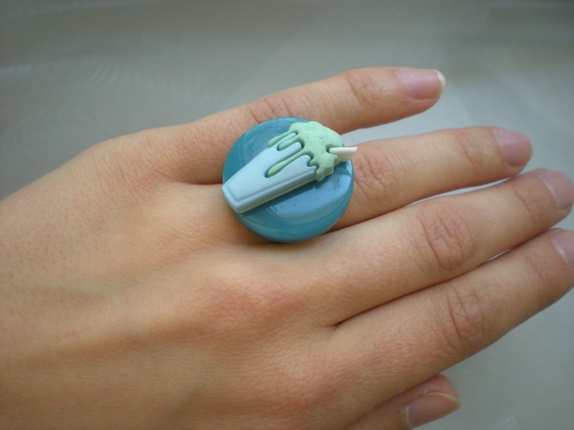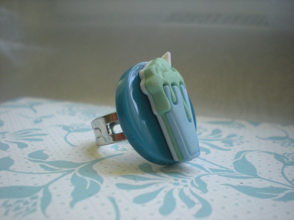 Turkis ring med lyse-blå og mint-grønn milkshake-motiv.