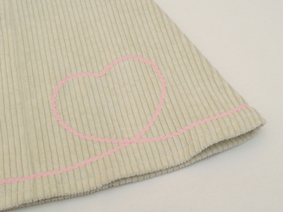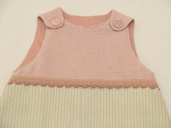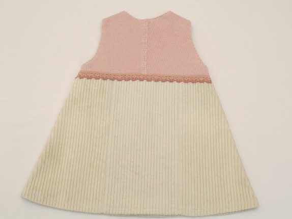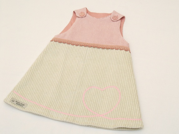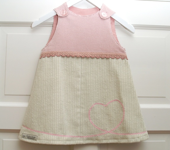 Hengslekjole sydd av to bredstripete cordfløyelsbukser. Bærestykket er lys rosa og skjørtedelen er hvit. Overdelen er foret med et ensfarget rosa bomullsstoff. Kjolen er pyntet både foran og bak med en gammelrosa, vevd blonde over brystet. På forsiden slynger et rosa hjerte av kroklisse seg over skjørtet.