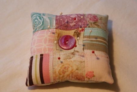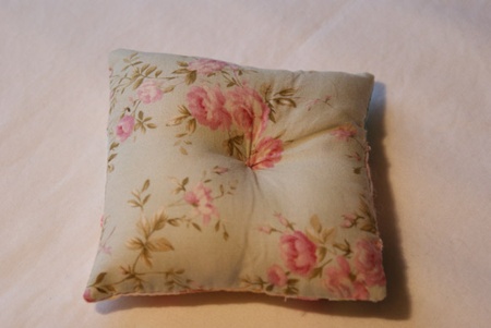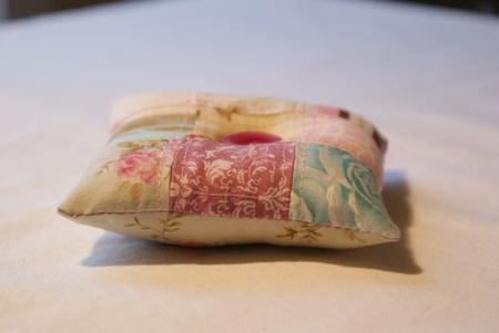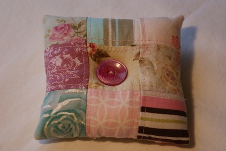 Nålepute i romantiske farger - rosa og sjøgrønn.Rosa knapp i midten.Nåleputen er fylt med fyllvatt.