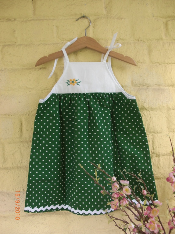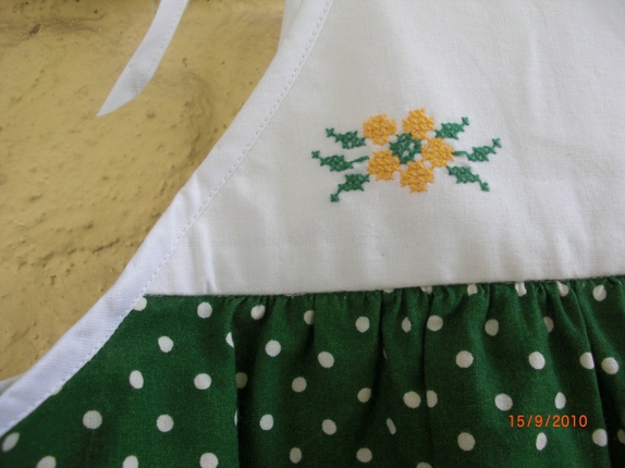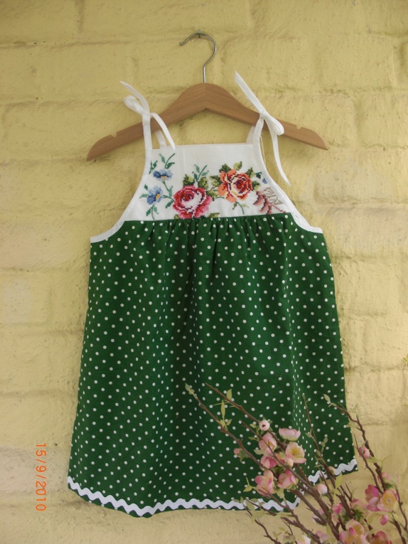 Kjempesøt kjole med brodert bærestykke laget av en fin gammel duk.