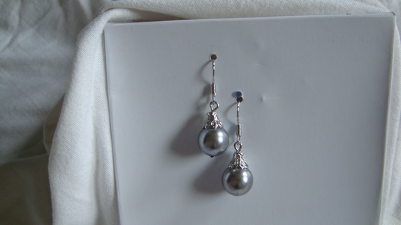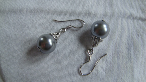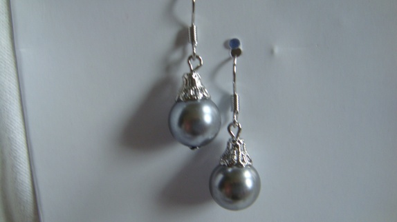 Øredobbene er laget av grå perle og sølv farget metall deler. Ferdig ned priset. se flere smykker på salg i butikken