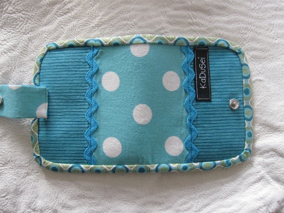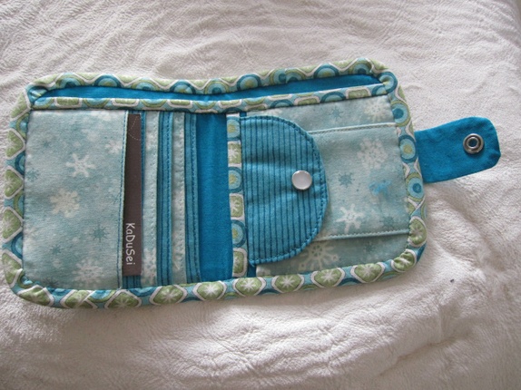Lommebok av bomullstoff med 8 lommer pluss myntlomme.(5 kortlommer)Mellomlegg er av kraftig og tett kvalitet(viledon og vliselin)som hindrer lommeboka i å virke "slamsete".Utbrettet måler den 22x13,5 cm