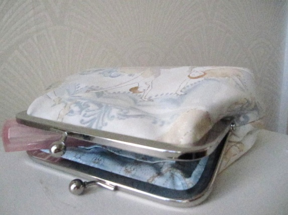 Ramme 15cm bred og 6,5 cm høy.Total høyde på pungen 13 cmBredde nederst 18 cm, bunn ca 5 cm vid