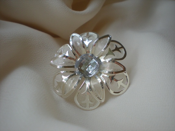Vakker ring i sølvfarget metall. I midten har den en glitrende strass-sten.