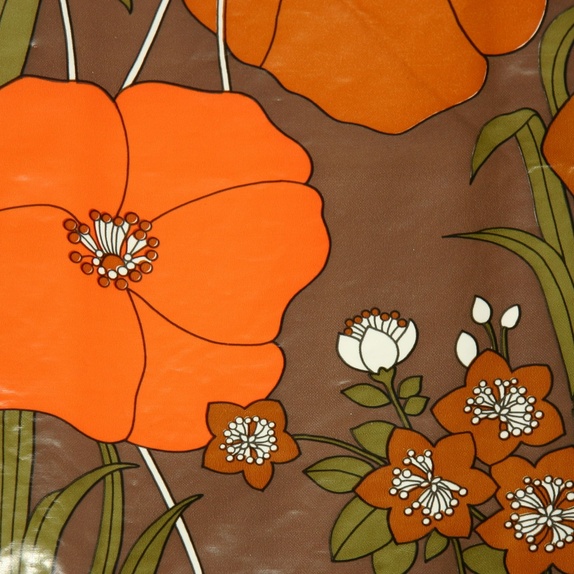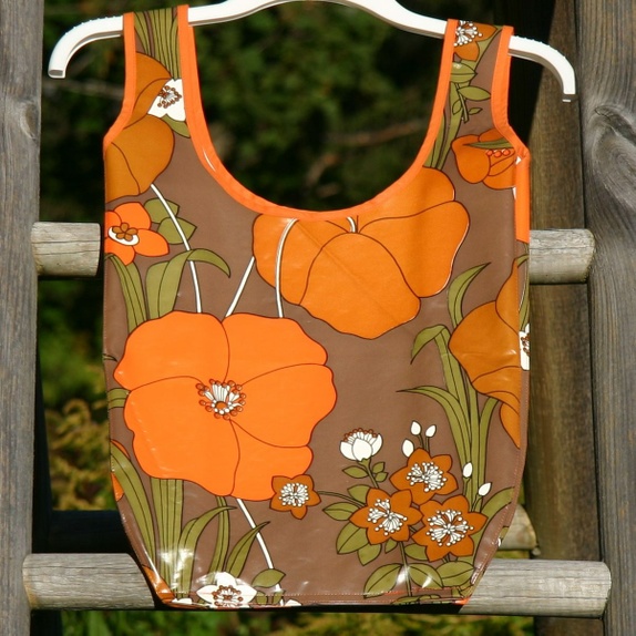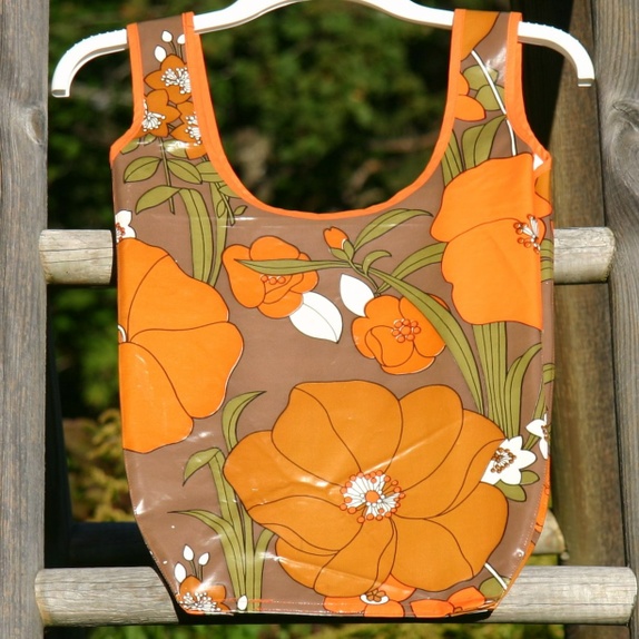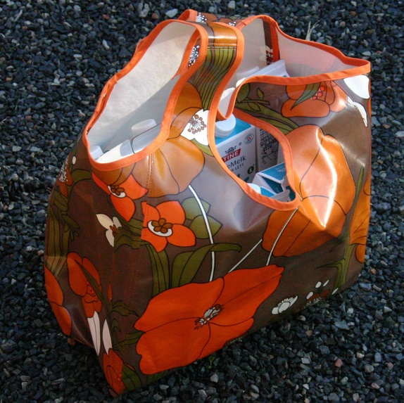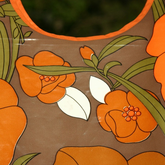 Denne er sydd i brun og oransje voksduk fra loppemarked med store valmuer på. Hankene er kantet med oransje skråbånd.
