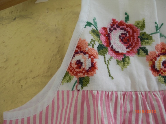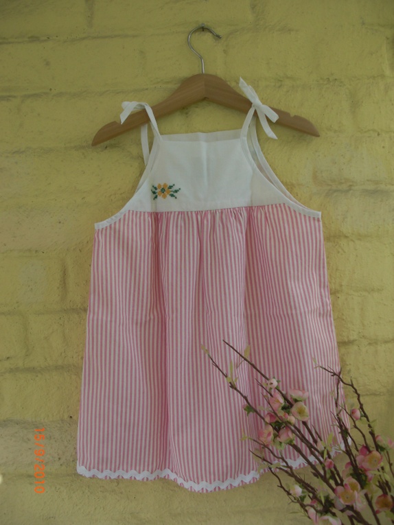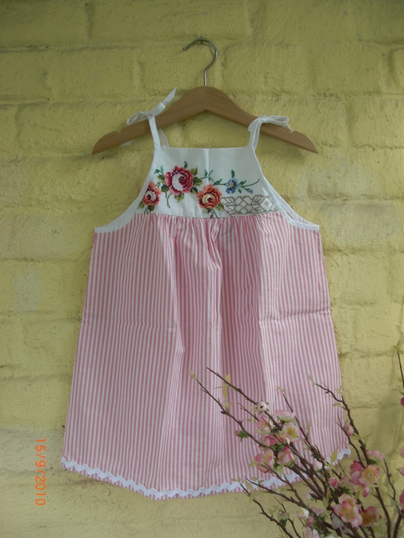 Kjempesøt kjole i med brodert bærestykke laget av en gammel duk. Resten av kjolen er rosa og hvitstripet.