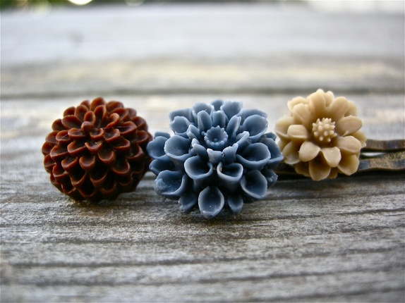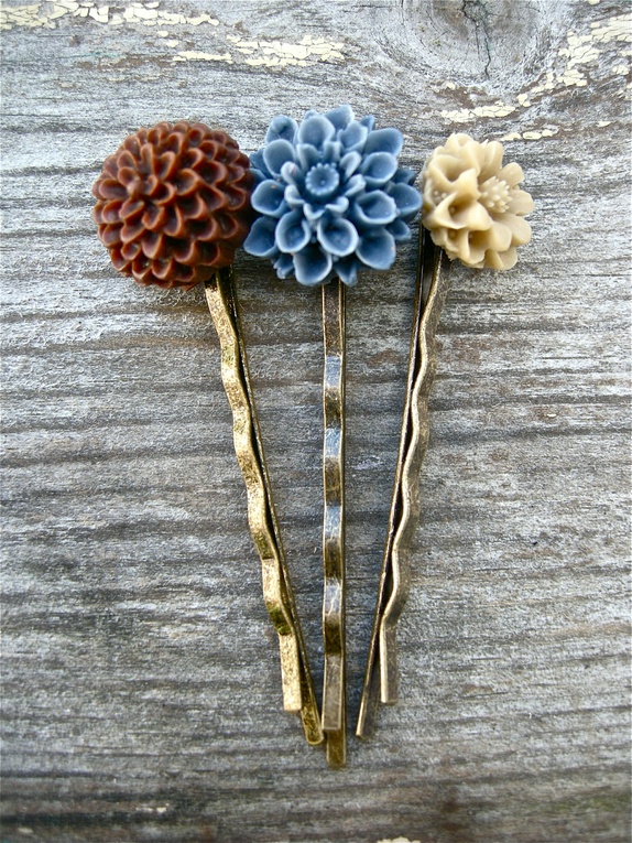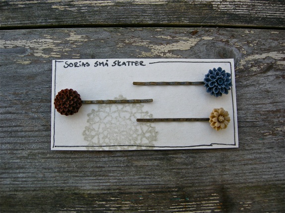 3 nydelige hårspenner i blå, brun og cremebeige.Hårnål i oksydert kobber med akrylblomster.Limet er profesjonelt smykke lim og etterpå lagt i herder. Hver spenne måler ca 5,5 cm.
