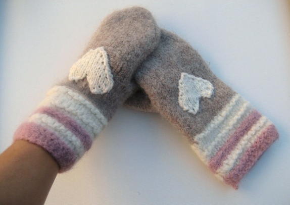 Skjønne og varme votter strikket i beige, naturhvit og rosa ull, deretter tovet. Vottene er pyntet med hvert sitt strikka hjerte i naturhvit ull.