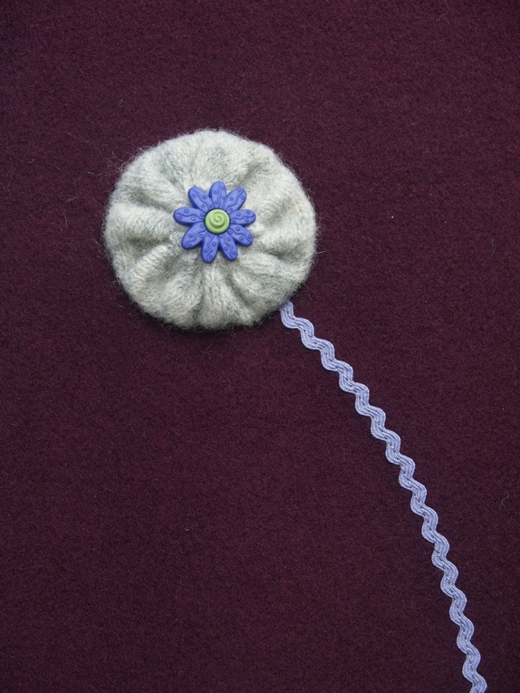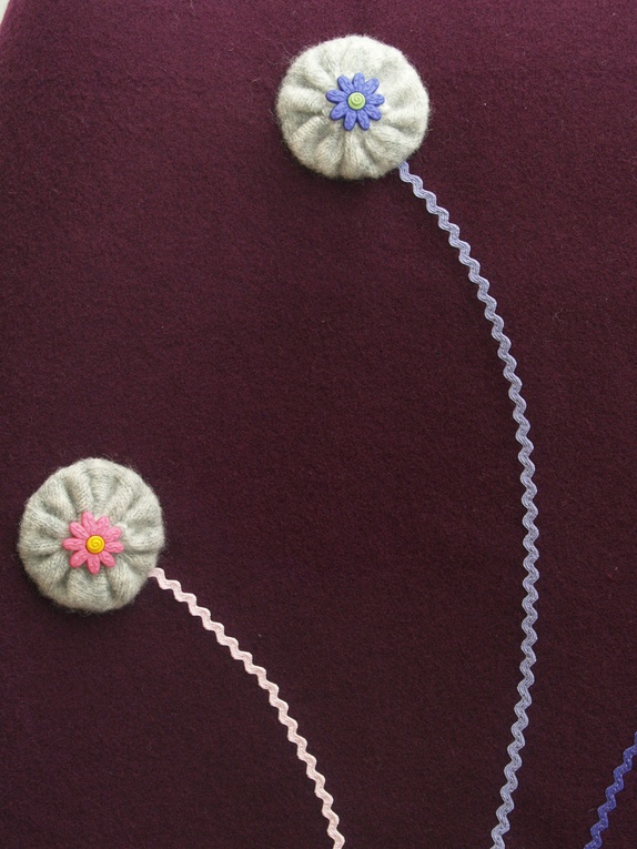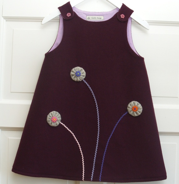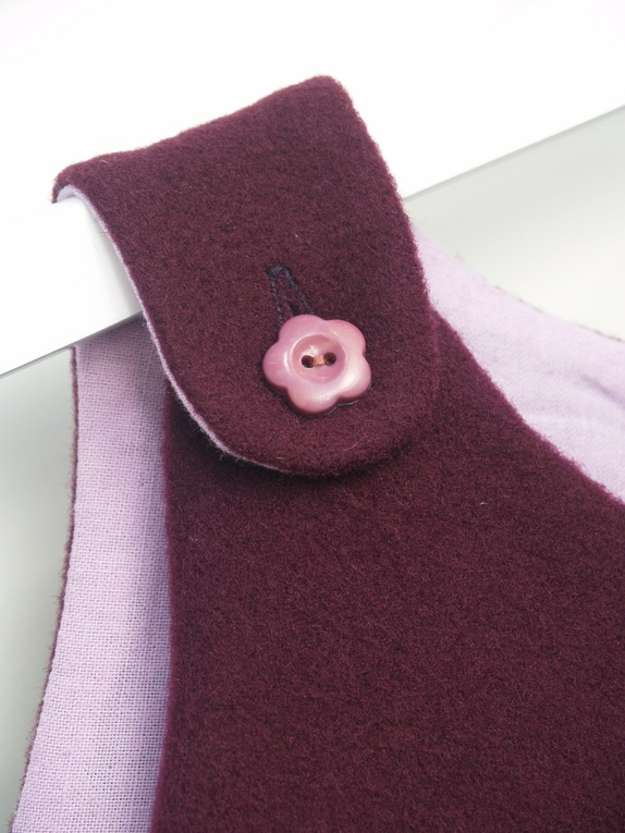 Kjolens overdel er foret med et rosa bomullsstoff. Foran er kjolen pyntet med tre blomster, sydd av stoff fra en lysegrå lammeullsgenser, kroklisser og knapper.