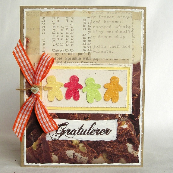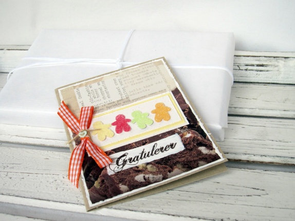 Det er pyntet med mønsterpapir med motiv av sjokoladekake og fire "seigmenn", som er håndstemplet og påført gjennomsiktig glassglitter, som er til forveksling lik sukkerstrø. "Gratulerer" er håndstemplet i sjokoladebrunt. En sløyfe med en liten knapp setter prikken over i'en.