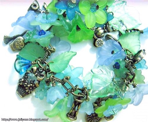 laget av luciteperler, krystaller, messing detaljer og vintage sjarmer(19 cm. + 4 cm. ex.kjede)
