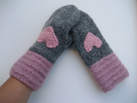 Skjønne og varme votter strikket i grå og rosa ull, deretter tovet. Vottene er pyntet med hvert sitt strikka hjerte i rosa ull.