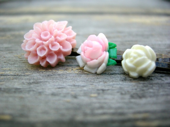 3 nydelige hårspenner i rosa og krem.Hårnål i oksydert kobber med akryl og håndmalt plast blomst.Limet er profesjonelt smykke lim og etterpå lagt i herder. Hver spenne måler ca 5,5 cm.