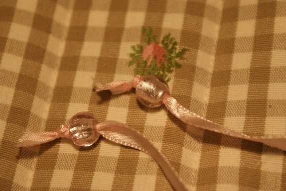 Etuiet er foret med offwhite bomull stoff og har et innlegg av vatt. Knyting med rosa satin bånd med rosa endestykker i glass