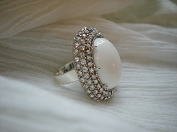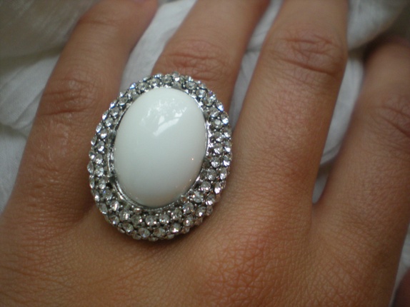 Oval ring i sølvfarget metall med hvit halvkule i plast og diamant-strass.
