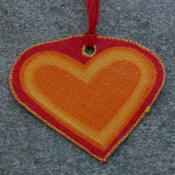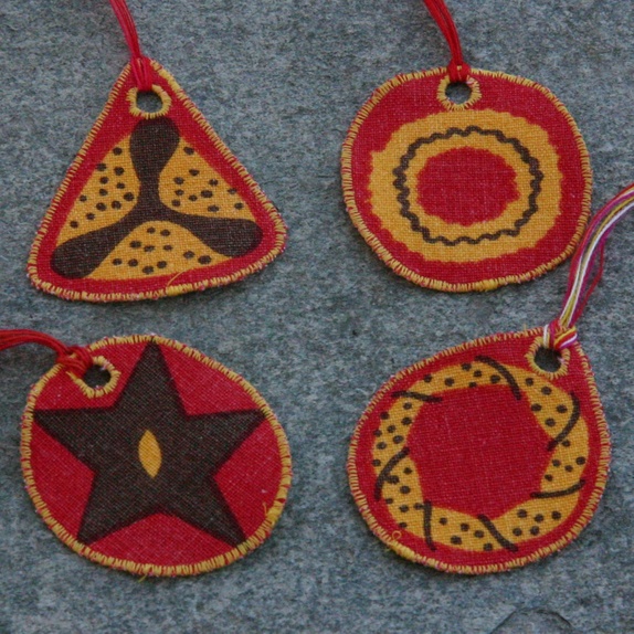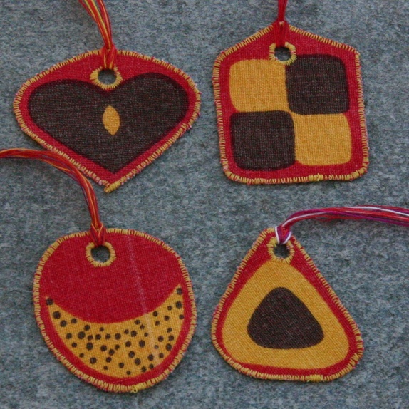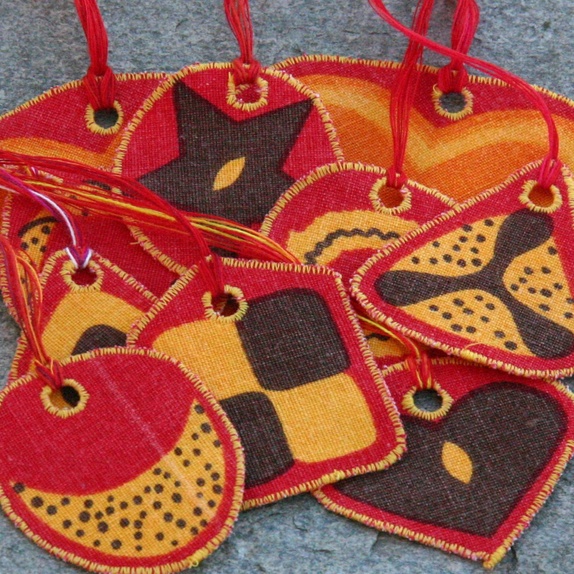 Gavelappene er sydd av en liten duk fra loppis. Det er ti stykker i pakka, åtte ulike med små stiliserte julekaker og to litt større hjerter.