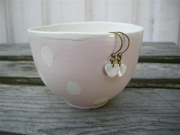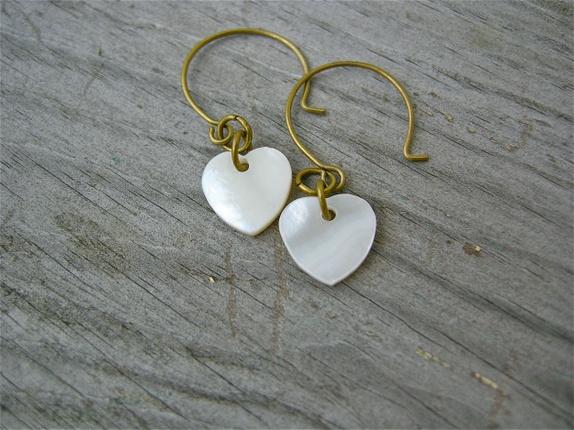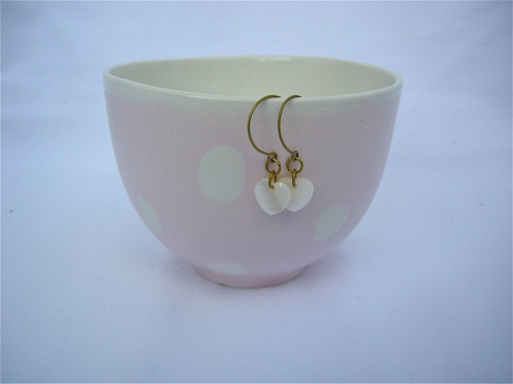 Vakre øredobber med hjerte av perlemor .ørekrok i oksydert kobber.Limet er profesjonelt smykke lim og etterpå lagt i herder. Måler ca 3 cm lang