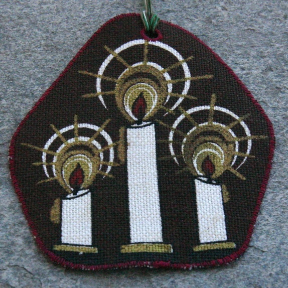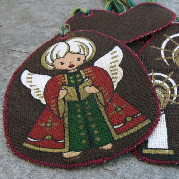 Disse er det morsomt både å gi bort og få. De er sydd av en liten brun juleduk fra loppis med engler og lys på. Pakken inneholder 8 gavelapper, to engler, to lysestaker og fire hjerter.