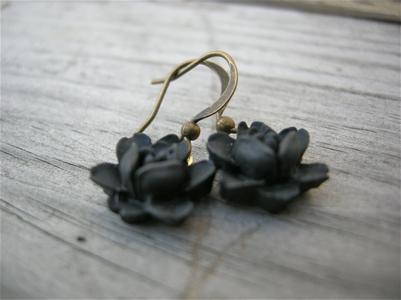 Vakre øredobber med sort akrylblomst .ørekrok i oksydert kobber.Limet er profesjonelt smykke lim og etterpå lagt i herder. Måler ca 2,5 cm lang.