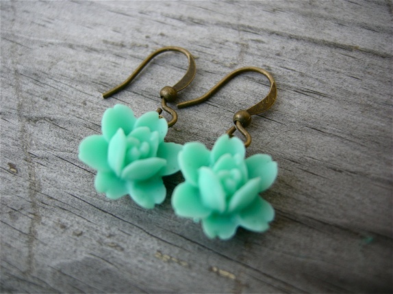 Vakre øredobber med grønn akrylblomst .ørekrok i oksydert kobber.Limet er profesjonelt smykke lim og etterpå lagt i herder. Måler ca 2,5 cm lang.
