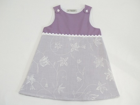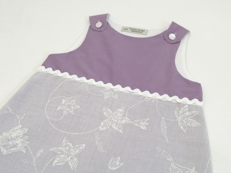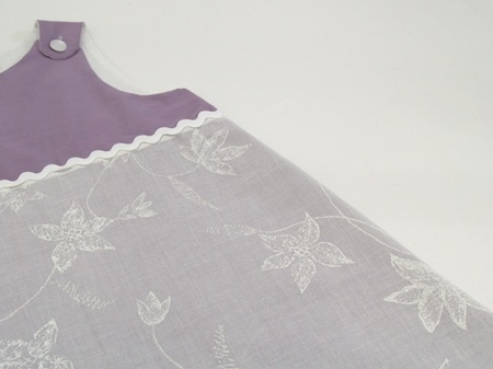 Søt, lett kjole i bomull i lys lilla og hvitt. Selve kjolen er sydd av en lys lilla herreskjorte. Utenpå kjolens underdel er det sydd på stoff fra en tynn, hvit, transparent gardin med hvite blomster som er trykket på stoffet. Kjolens overdel er foret med ensfarget hvitt bomullsstoff. Over brystet er det sydd på en bred, hvit kroklisse. Perlemorsknapper.