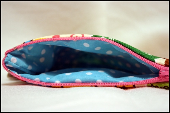 Fargerik pung med rosa glidelås og foret med turkist stoff med hvite prikker.