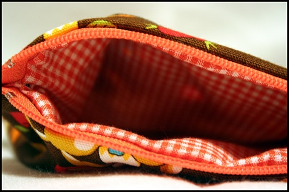 Pung i kjempesøtt stoff med oransjerutet innside og oransje glidelås.