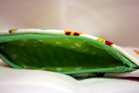 Pung med soppmønster, vårgrønn glidelås og foret med limefarget stoff med hvite prikker.