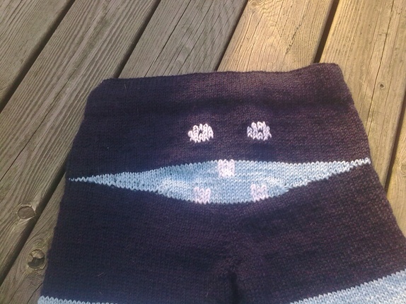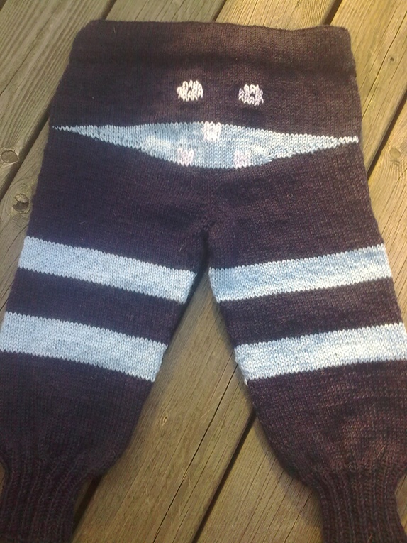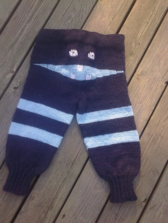 Morsom monster bukse i str. 1 år, strikket i tynt ullgarn, kan maskinvaskes.Fargene: mørkeblå, lyseblå og hvit.