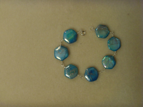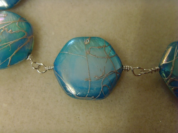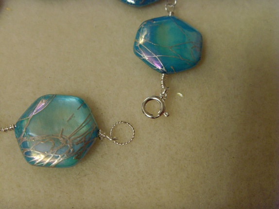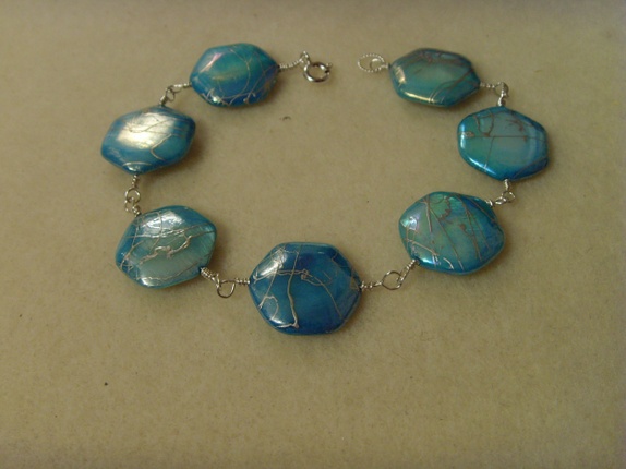 Armbåndet består av sekskantede, flate skjellperler med sølvstriper. Stripene ligger litt forskjellig på hver perle og overflaten på perlene er lett avrundede og har et flott fargespill, som gir mye liv til smykket. Fargen på perlene er en flott turkis-blå nyanse.