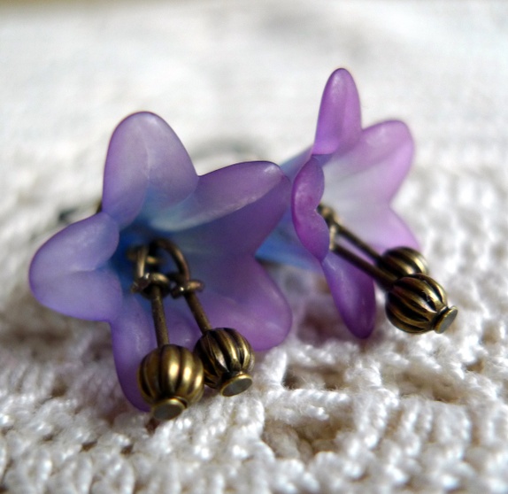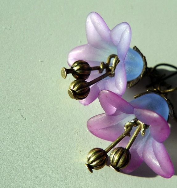 Selve blomsterklokkene er laget i 'lucite' som ser ut som matt, frostet glass. Metallet er messing, som så klart er bly- og nikkelsikkert. Ørepynten måler drøye 5 cm fra topp til tå, mens selve blomsterklokkene er 1,4 cm.