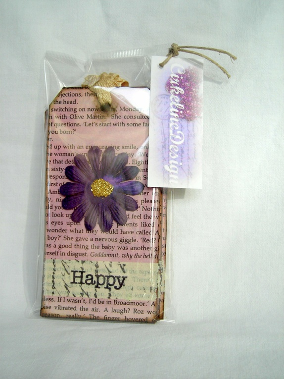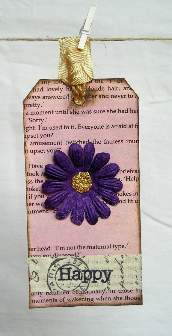 De er pyntet med ark fra en engelsk bok og en store lilla blomst med gull glassglitter i midten. "Happy" er stemplet i sort. Kantene er svertet for en vintage look. På baksiden er det stemplet "Til" og "Fra", og det er plass til en personlig hilsen. Gavelappene har beige/gullfargede sløyfebånd.