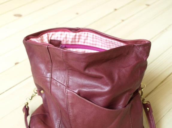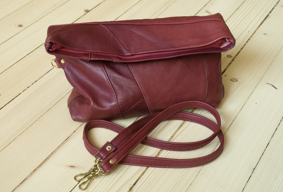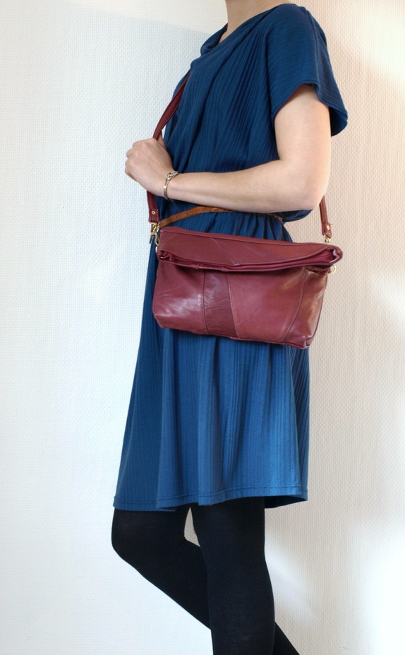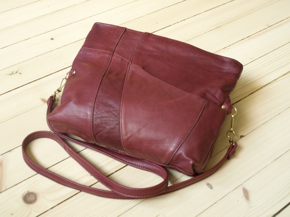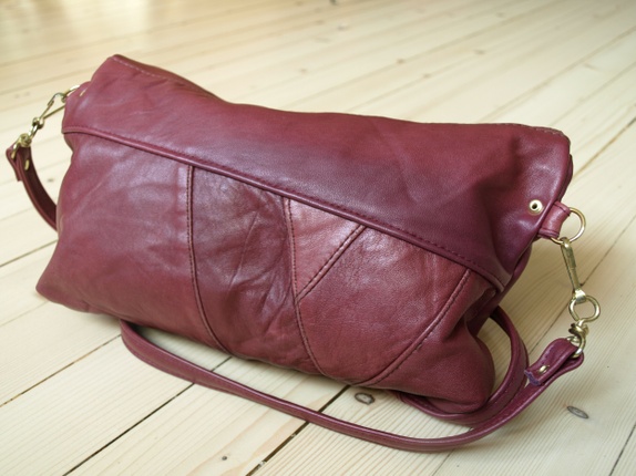 Liten veske i skinn laget av rester fra et tidligere prosjekt.