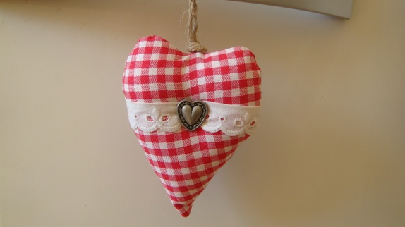 Hjerte er 11 cm + oppheng på 7 cm.Det er pyntet med tinnknapp og blonde på begge sider.