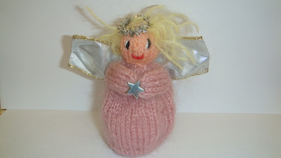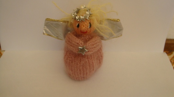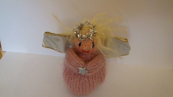 Engelen har kjole strikket i gammelrosa.Høyden er 10 cm,vingene er laget av bånd med ståltråd i så de kan forandre fasong.