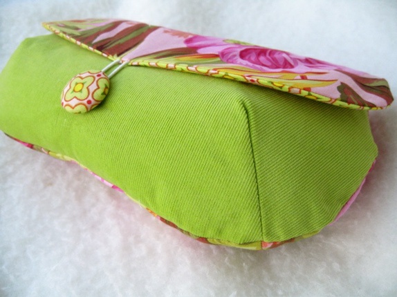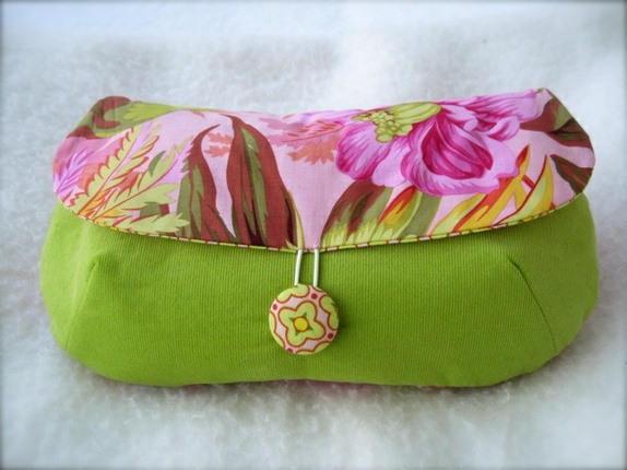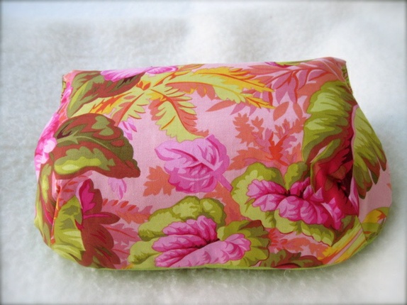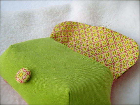 - Toalettmappe laget i fløyel og bomull. Foret med bomull i grønn, gul og rosa og med strykeinnlegg på alle lag for stabilitet og styrke.