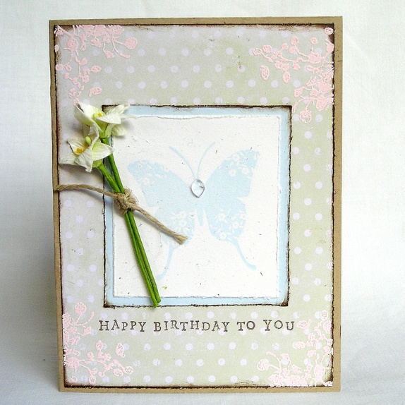 Det er pyntet med mønsterpapir i vintagestil, en håndstemplet lys blå sommerfugl med en liten bling og to vakre, hvite liljer med hampsnor.
