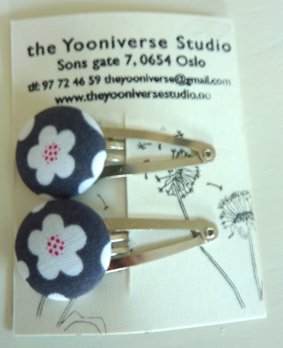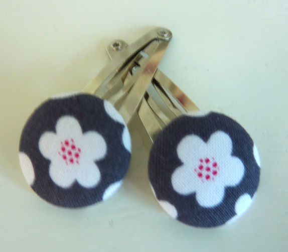 2 stk clips spenner for jålete jenter. Lettere for små fingre enn bobby pins. Stoff knapper 23mm i diameter trukket med bomullstoff med jålete jenter i alle aldre.