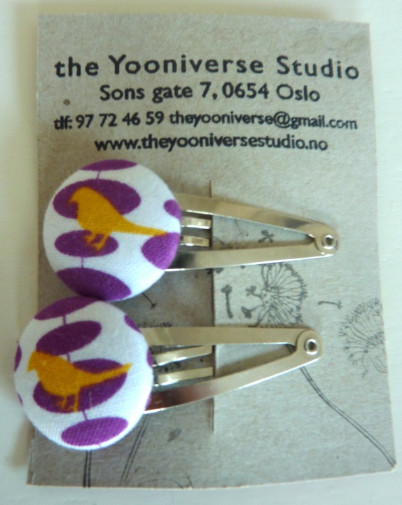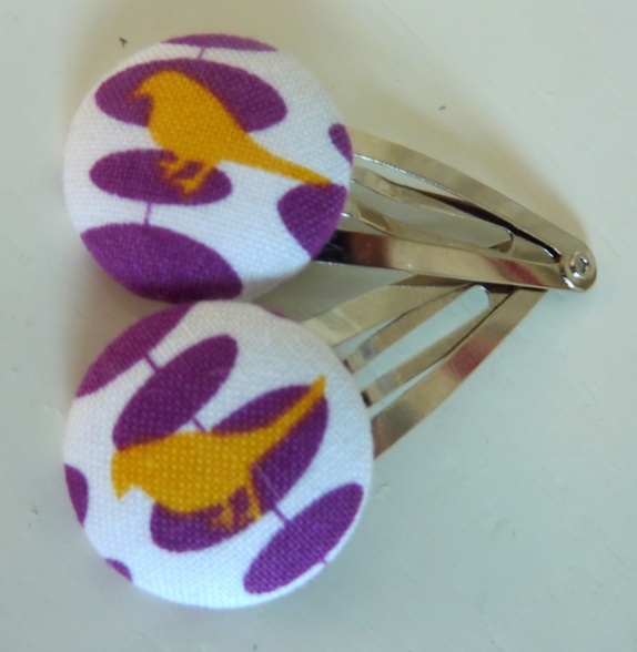 2 stk clips spenner for jålete jenter. Lettere for små fingre enn bobby pins. Stoff knapper 23mm i diameter trukket med bomullstoff med jålete jenter i alle aldre.