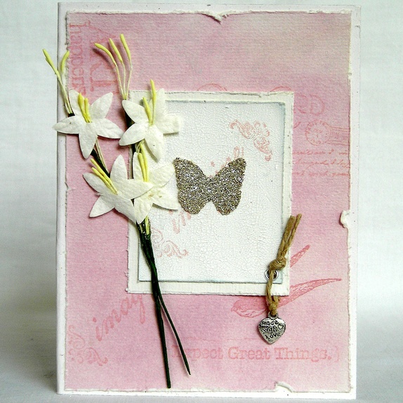 Det er pyntet med akvarellpapir, som er håndfarget i blekrosa og påstemplet svake bakgrunnsord. Sommerfuglen er i sølv glassglitter og festet på kartong, som er malt med krakeleringsmaling. I tillegg er det pyntet med hvite blomster og et lite sølvhjerte i hamptråd med ordene "Made with love".