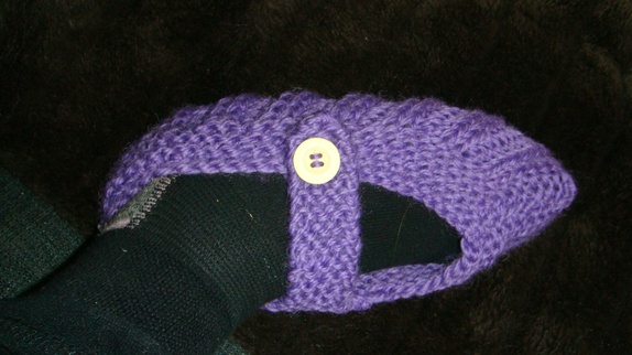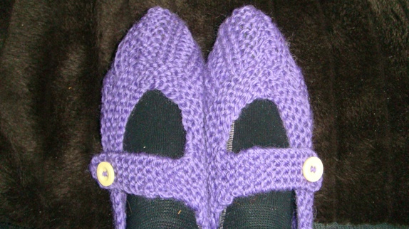 Tøflene er strikket i 85% ull og 15% mohair. Passer de fleste. (bildet av den ene tøfelen viser riktig farge)