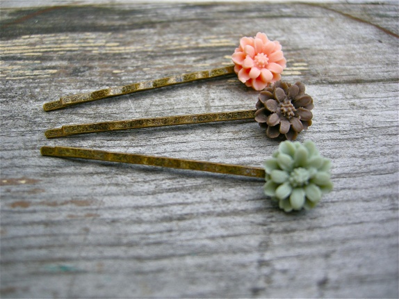 3 nydelige hårspenner i brun,grønn og fersken.Hårnål i oksydert kobber med akrylblomster.Limet er profesjonelt smykke lim og etterpå lagt i herder. Hver spenne måler ca 5,5 cm.