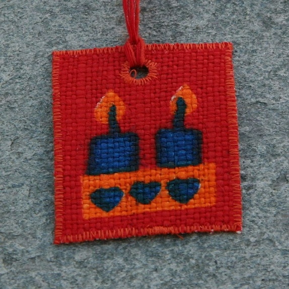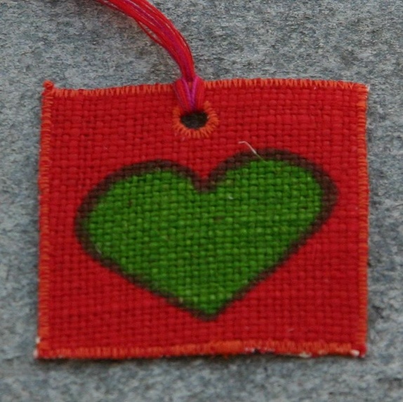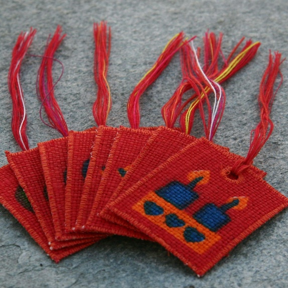 Gavelappene er sydd av en liten strieduk fra loppis med hjerter, lysestaker og julebukk. Hver pakke har åtte lapper, to av hvert motiv.
