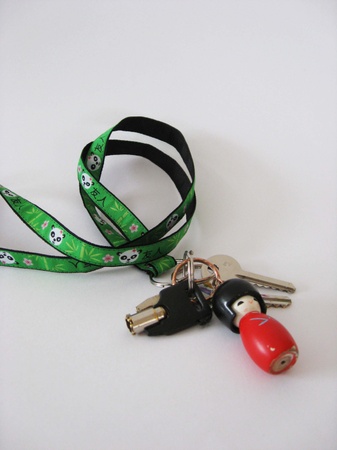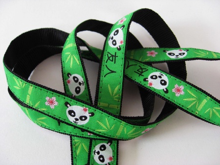 Nøkkelbånd sydd av nydelig, vevd bånd med rødt sort ripsbånd på baksiden. Båndet er grønt med motiv av små søte pandahoder, litt blomster og bambus...